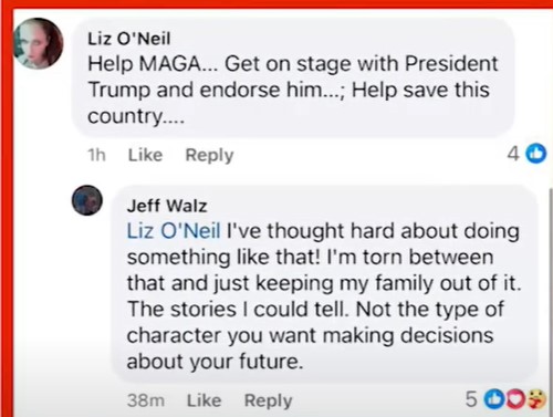 Jeff Walz’s Facebook profile was discovered by Laura Loomer. Jeff commented that his brother is “not the type of character you want making decisions about your future.”